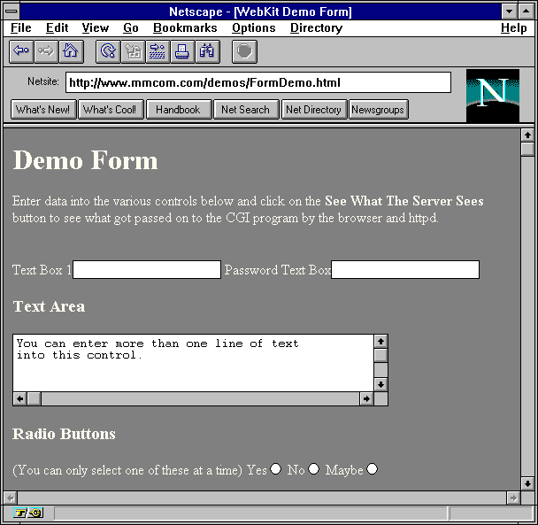 Forms and Server ProgrammingThe true power of Web technology comes from the ability of the server to execute a program rather than just serving an existing document file. All of the popular servers support something called CGI for Common Gateway Interface. This is a mechanism for executing an arbitrary program and serving the output of that program back to a client. To do this, the server is configured so that a URL requesting certain document paths is interpreted as a request to execute a program. Different servers manage this in different ways, but essentially either all the files in a particular directory on the server are designated as executables, or the server interprets certain filename suffixes (e.g., .exe) to mean that the file should be executed rather than served as a document. One of the ways that a browser requests a program execution rather than a document is through the use of an HTML form. An HTML form is a document that contains HTML tags that display various controls for entering data such as text boxes, radio or command buttons, and lists. The form also contains a URL that specifies the program to execute to analyze and respond to the data entered into the form. For a demo of HTML forms capabilities, use this URL: http://www.mmcom.com/demos/FormDemo.html Another way to invoke a program execution instead of a document access is through various search requests. Reducing the Cost of Doing Business [Previous][Next] |